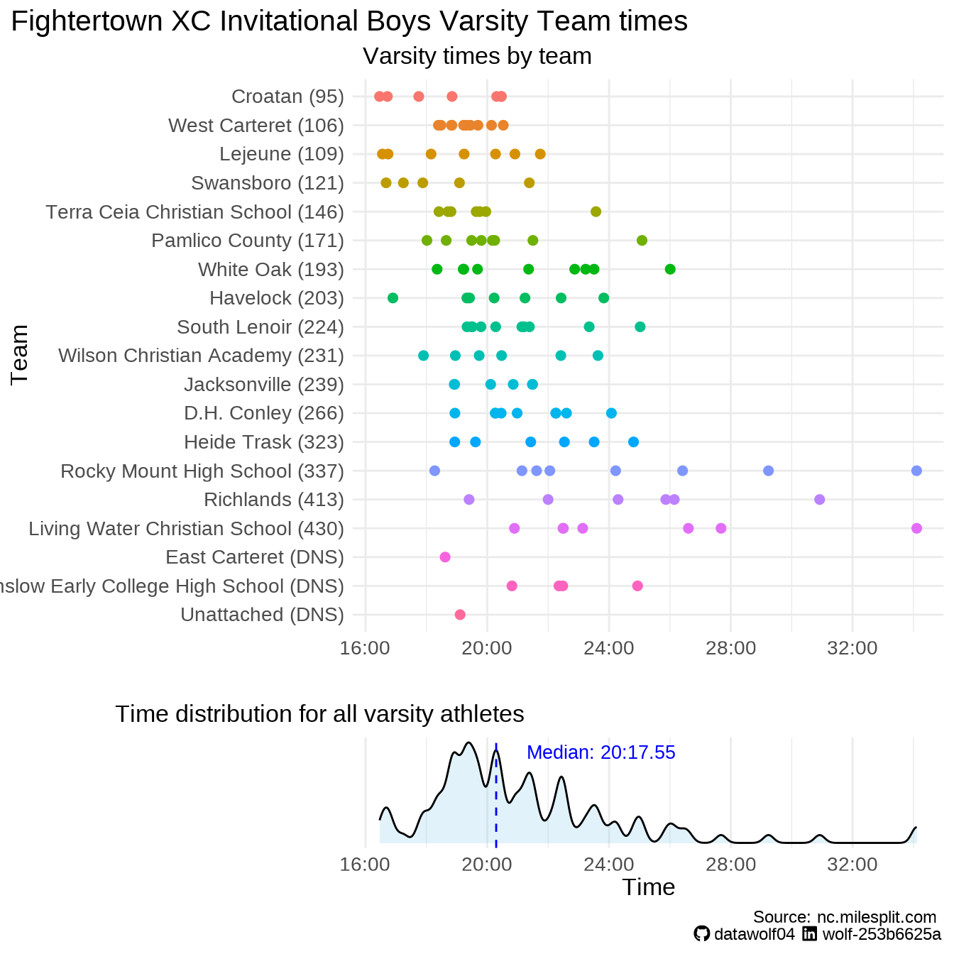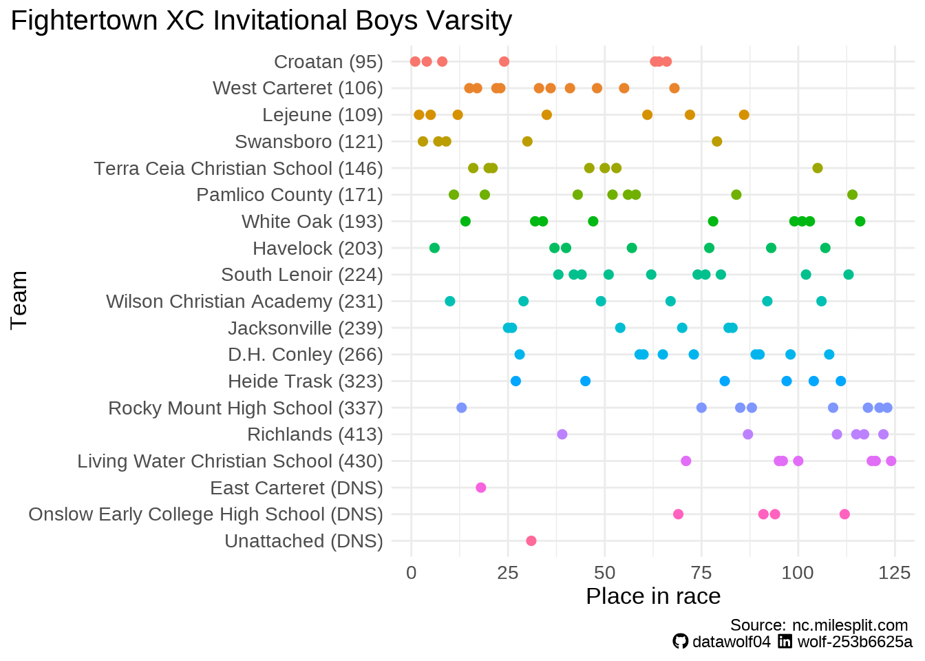 It’s been a while since I’ve posted on this portion of my blog. I’ve been getting geared up for my sons’ upcoming Cross Country seasons. As a former NCAA athlete in this sport (not good enough for a scholarship), I get very fired up this time of year. So I’ve been scraping some results from Milesplit and visualizing the team results.